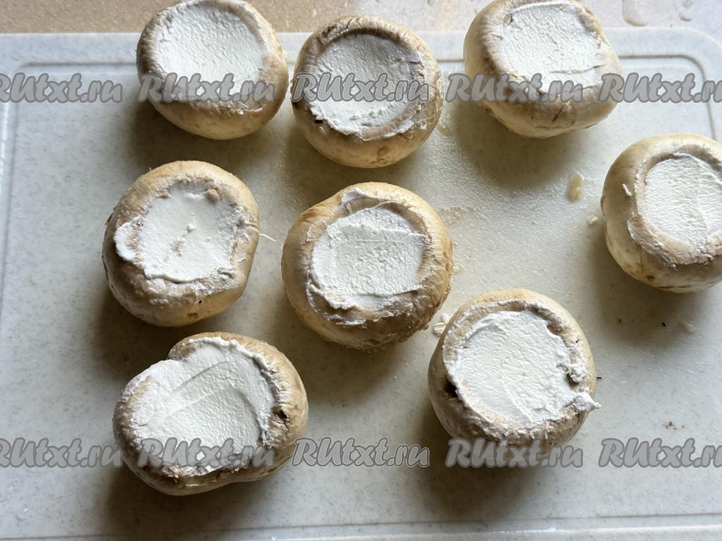 Наполнить шляпки шампиньонов творожным сыром.