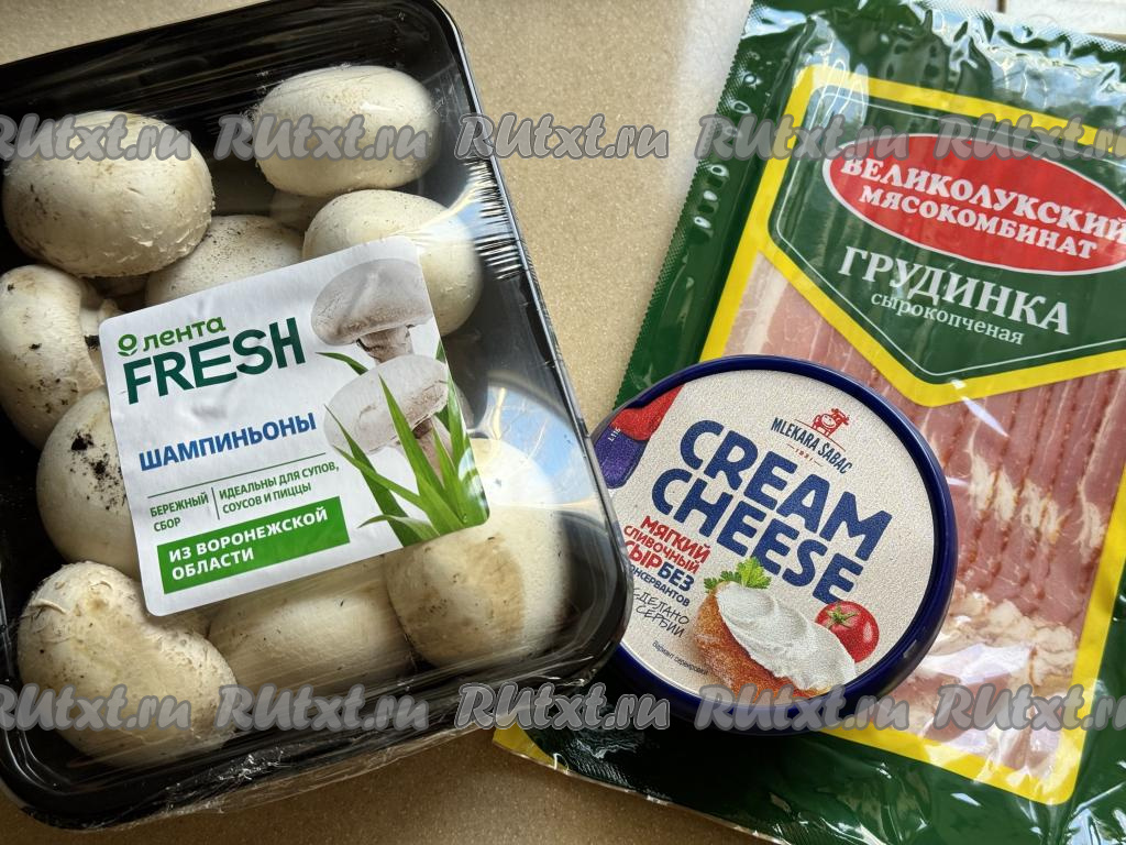 Подготовить продукты. Шампиньоны лучше всего брать примерно одинакового размера, я предпочитаю использовать для этой закуски грибы чуть больше среднего размера. Бекон я взяла сырокопчёный. Фаршировать шампиньоны можно как сливочным пастообразным сыром (именно его я и купила), так и творожным.