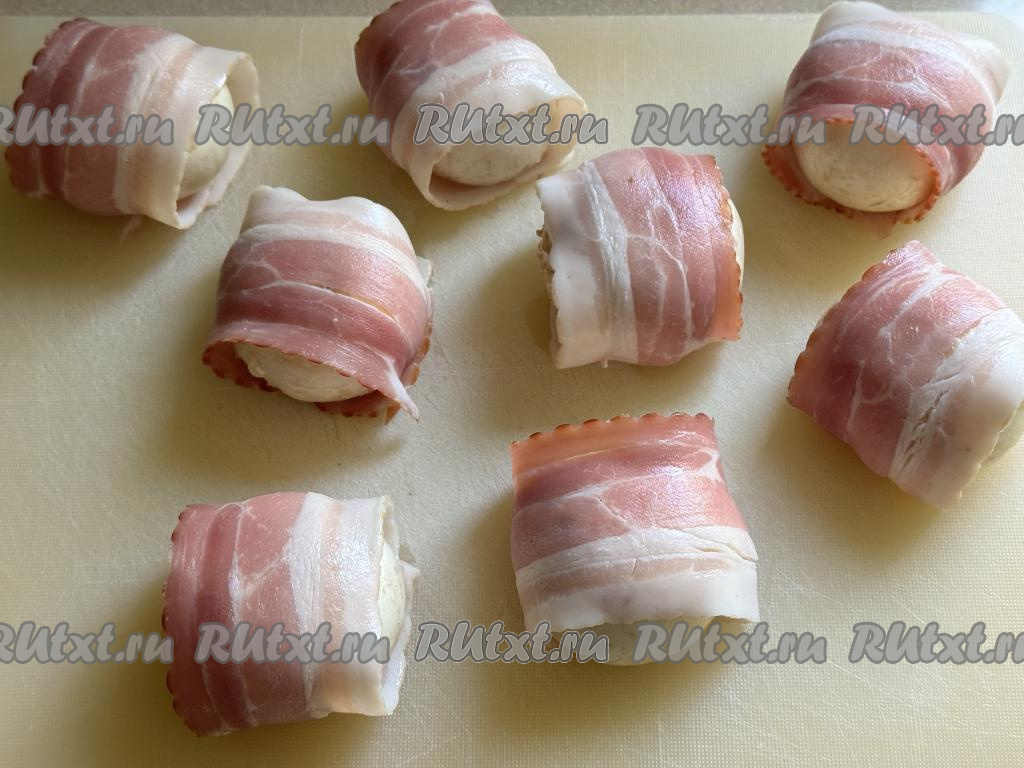Бекон я купила уже нарезанный на тонкие полоски. Если вы купили бекон одним куском, тогда его нужно будет нарезать на тонкие, длинные полосы. Каждую шляпку шампиньона, фаршированную сыром, обернуть в полоску бекона.