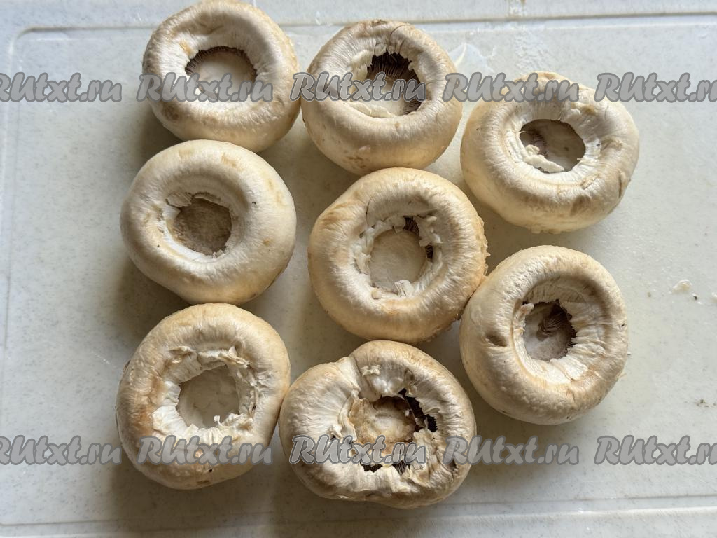 Ножки шампиньонов отделить от шляпок грибов. Ножки шампиньонов нам в этом рецепте не понадобятся, их можно использовать, например, для приготовления супа. Шляпки шампиньонов промыть водой, немного обсушить.