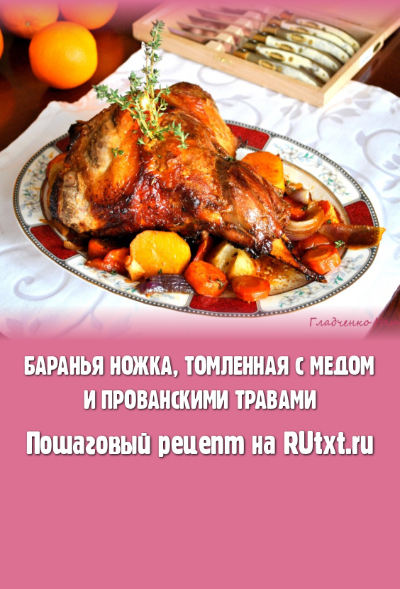Ножку обмазать оливковым маслом и медом, посыпать солью, перцем и томить в духовом шкафу при температуре 160 градусов в течение 3 часов. Каждые 30 минут ножку переворачивать и поливать соком. Если сока выделяется недостаточно, то можно использовать бульон.