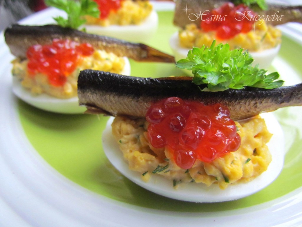 Вариантов приготовления фаршированных яиц очень много. Один из вариантов - это фаршированные яйца со шпротами. Выглядит такая закуска на праздничном столе очень аппетитно, да и на вкус хороша. Перед подачей фаршированные яйца можно дополнительно украсить, например, зеленью. Я подавала их на новогодний стол, поэтому украсила красной икрой. Приготовьте фаршированные яйца со шпротами и вкус этого простого блюда вас точно не разочарует!