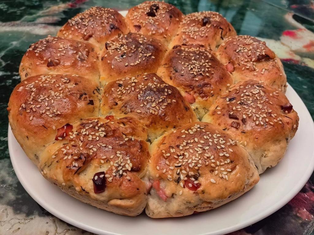 Поднявшиеся булочки смазать молоком, по желанию, посыпать сверху кунжутом.