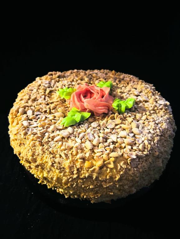Арахисом полностью обсыпать верх и бока торта, сверху немного посыпать сахарной пудрой.