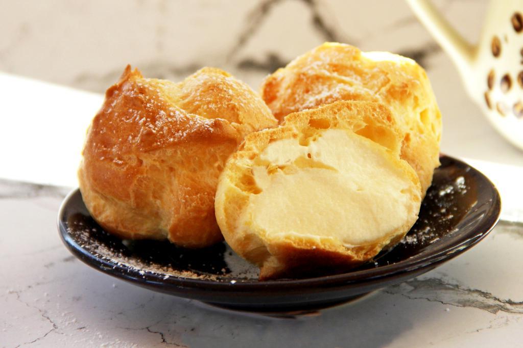 А вот как профитроль с заварным кремом "Пломбир" выглядит в разрезе. Пирожные с таким кремом получаются просто тающими во рту. Угощайтесь!