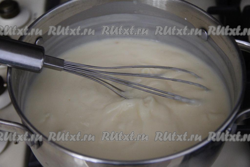 Постоянно перемешивая венчиком, довести крем до кипения, затем немного уменьшить огонь, проварить 1 минуту (до загустения) и убрать с огня.