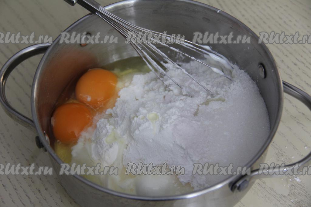 Перемешать массу венчиком, она получится достаточно жидкой. Поставить кастрюлю на средний огонь.