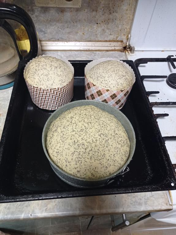 Далее тесто еще немного вымесить, муки не подсыпать, тесто уже не должно совсем липнуть ни к столу, ни к рукам. Формы для куличей смазать растительным маслом и поместить в них тесто, заполняя на 1/3 объёма.