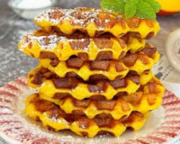 Частями добавляя оставшуюся муку и полностью вмешивая её столовой ложкой, замесить в меру густое тыквенное-творожное тесто для вафель. В зависимости от сочности тыквы, величины яйца, качества муки, вам может потребоваться муки больше или меньше, чем указано в ингредиентах, главное - ориентироваться на густоту замешиваемого теста для вафель. ... Электрическую вафельницу разогреть, смазать створки…