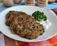 Получившуюся массу тщательно перемешать, добавить соль и чёрный молотый перец, ещё раз перемешать картофельно-грибное тесто для драников. Получившуюся массу тщательно перемешать, добавить соль и чёрный молотый перец, ещё раз перемешать картофельно-грибное тесто для драников. В сковороде прогреть растительное масло, выкладывать по 1-1,5 столовых ложки картофельно-грибного теста в виде оладий, жарить драники на среднем огне до подрумянивания снизу.