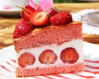 Ко взбитой яичной массе начать частями добавлять просеянную муку, каждый раз вмешивая её при помощи лопатки. Тесто должно получиться воздушным, нежным и в меру густым, напоминающим сметану средней жирности. ... Бока и дно разъёмной формы для выпечки (я выпекала в форме диаметром 22 сантиметра) слегка смазать растительным маслом. Вылить тесто в форму, разровнять и поставить в духовку, разогретую до 180 градусов.