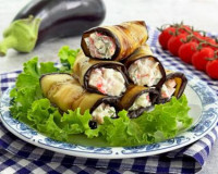 Рулетики из баклажанов готовят многие из нас, постоянно экспериментируя с различными начинками. В этот раз предлагаю для праздничного стола или семейного ужина приготовить вкусные, пикантные рулетики из баклажана с аппетитной, нежной начинкой из крабовых палочек, чеснока и творожного сыра. ... Положить на более узкий край каждой полоски из баклажана по 1 чайной ложке начинки из сыра и крабовых палочек. Завернуть полоску баклажана в рулетик, начиная со стороны с начинкой.