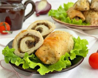 На отбитый кусок филе выложить часть грибной начинки. Грибную начинку присыпать частью натёртого сыра. Грибную начинку присыпать частью натёртого сыра. Завернуть куриное филе с начинкой в плотный рулетик. Завернуть куриное филе с начинкой в плотный рулетик.