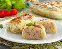 Лист китайской капусты выложить на доску и слегка отбить утолщённую часть листа. Начинку разделить на 8 частей. Выложить одну часть начинки ближе к узкой части листа, обязательно отступая от краёв листа. ... Подвернуть края листа на начинку, как на фото. Подвернуть края листа на начинку, как на фото. Завернуть начинку в лист пекинской капусты в виде рулетика, в результате получится голубец.