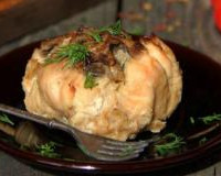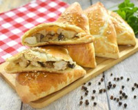 Остывшую курино-грибную начинку зрительно делим на 5 частей. В центр раскатанной круга из слоёного теста выкладываем одну часть начинки. Края теста скрепляем над начинкой в форме треугольника, как на фото. Края теста скрепляем над начинкой в форме треугольника, как на фото.