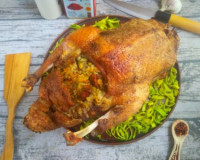 В остывшую начинку добавить, по желанию, нарезанную свежую зелень. Внутрь утки выложить подготовленную начинку из риса и овощей. ... Внутрь утки выложить подготовленную начинку из риса и овощей. Места разреза фаршированной утки скрепить зубочистками, полностью закрывая начинку (как на фото).