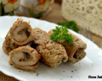 В самом конце жарки немного посолить грибную начинку для мясных рулетиков. Остудить грибную начинку. Тем временем вымыть, обсушить шампиньоны, произвольно нарезать (я использовала замороженные шампиньоны). ... В самом конце жарки немного посолить грибную начинку для мясных рулетиков. Остудить грибную начинку. На каждый пласт свинины выложить по 1-2 чайных ложки грибной начинки.