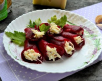 Сюда же добавить пропущенный через пресс чеснок и немного соли, перемешать сырную начинку. Сыр натереть на средней (или мелкой) тёрке, добавить сметану и французскую горчицу. Сюда же добавить пропущенный через пресс чеснок и немного соли, перемешать сырную начинку. Поместить 1 чайную ложку сырной начинки на ломтик свеклы. Поместить 1 чайную ложку сырной начинки на ломтик свеклы.