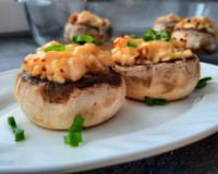 Снять с огня, дать куриному фаршу с ножками шампиньонов и луком немного остыть и начинка для фарширования грибов готова. В сковороду к луку и грибам добавить куриный фарш, посолить и обжаривать минут 5, перемешивая и разбивая комочки фарша. Снять с огня, дать куриному фаршу с ножками шампиньонов и луком немного остыть и начинка для фарширования грибов готова. Далее необходимо каждую шляпку шампиньонов наполнить, примерно, 1 столовой ложкой начинки.