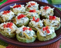 Кружочки жареных кабачков выложить на тарелку, сверху разместить по ложке сырной начинки. Кружочки жареных кабачков выложить на тарелку, сверху разместить по ложке сырной начинки.