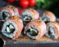 С помощью циновки свернуть нори с начинкой в плотный ролл так, чтобы рис оказался снаружи. Начинаем заворачивать со стороны, где край с рисом, а пустой край листа нори закрепляет ролл. С помощью циновки свернуть нори с начинкой в плотный ролл так, чтобы рис оказался снаружи. Начинаем заворачивать со стороны, где край с рисом, а пустой край листа нори закрепляет ролл.