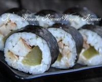 Далее выдавить из кондитерского мешка творожный сыр. Свернуть лист с начинкой в плотный рулет. Край листа нори, на котором нет риса, смазать водичкой, так он хорошо склеится и ролл получится плотным и красивым. Свернуть лист с начинкой в плотный рулет. Край листа нори, на котором нет риса, смазать водичкой, так он хорошо склеится и ролл получится плотным и красивым.