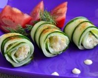 Сырную массу тщательно перемешать и начинка для рулетиков из свежих огурцов готова. Выложить сырную начинку горизонтально на нижнюю часть огурцов. Сырную массу тщательно перемешать и начинка для рулетиков из свежих огурцов готова. Выложить сырную начинку горизонтально на нижнюю часть огурцов.