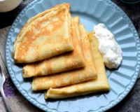 (в тесто) + для смазывания сковороды перед жаркой первого блинчика; сахар - 2 ст. л. (в тесто) + 4-5 ст. л. (для начинки); сливочное масло - 30-40 г. Стакан ёмкостью 200 мл. К яйцам добавить 2 столовые ложки сахара, ванильный сахар и соль.