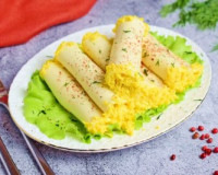 А с начинкой для этой закуски можно немного поэкспериментировать по своему вкусу. ... В начинку пойдут белки, натрите их на тёрке и добавьте к нарезанному куриному мясу.