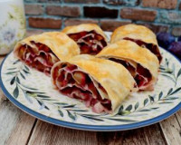 Разложить на лаваш сливовую начинку, отступив от краёв лаваша по 3 сантиметра. Прямоугольный лист лаваша разложить на столе. Я взяла лист размерами 32 сантиметра на 52 сантиметра. Разложить на лаваш сливовую начинку, отступив от краёв лаваша по 3 сантиметра. Подвернуть на начинку два длинных края.