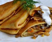 На блин выложить 1 столовую ложку грибной начинки. На блин выложить 1 столовую ложку грибной начинки. Подвернуть вначале 2 боковые стороны блина на начинку, а затем, начиная с одной из неподвёрнутых сторон, свернуть блин с грибами конвертиком. Подвернуть вначале 2 боковые стороны блина на начинку, а затем, начиная с одной из неподвёрнутых сторон, свернуть блин с грибами конвертиком.