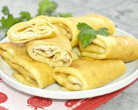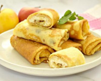 На готовый блинчик кладём 1 столовую ложку начинки из творога и яблока ближе к одной стороне. Сворачиваем блинчик конвертиком, подворачивая три стороны блина на начинку и скручивая его в рулет, начиная со стороны с начинкой. ... На готовый блинчик кладём 1 столовую ложку начинки из творога и яблока ближе к одной стороне. Сворачиваем блинчик конвертиком, подворачивая три стороны блина на начинку и скручивая его в рулет, начиная со стороны с начинкой.