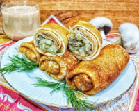 Для этого, отступая от краёв блина, выкладываем 1 столовую ложку с верхом начинки из капусты и грибов. Подворачиваем вначале боковые стороны блина на капустно-грибную начинку, а затем, начиная с края с начинкой, сворачиваем блинчик конвертиком. Подворачиваем вначале боковые стороны блина на капустно-грибную начинку, а затем, начиная с края с начинкой, сворачиваем блинчик конвертиком.