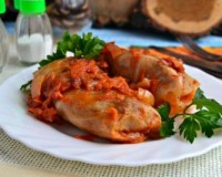 Поместить по ложке фарша на капустный лист. Свернуть листья с фаршем конвертиком. Свернуть листья с фаршем конвертиком. Поместить все голубцы в форму для запекания.