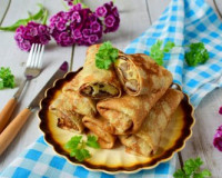 На один конец кабачкового слайса выложить 1 столовую ложку начинки. На один конец кабачкового слайса выложить 1 столовую ложку начинки. Завернуть начинку в несколько оборотов, формируя голубец из кабачка с начинкой.