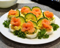 Разрезать яйца пополам, вынуть желтки. Яйца отварить в кипящей воде в течение 8-10 минут, а затем полностью охладить их и очистить. ... Фаршированные яйца выложить на тарелку для подачи. Оставшуюся красную рыбу нарезать на тонкие полоски, свернуть в виде розочек и украсить фаршированные яйца сверху.