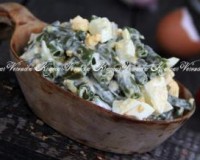 Нарезать яйца на кубики. Чеснок очистить. Яйца предварительно сварить (в течение 10 минут с момента закипания воды), остудить и очистить. Нарезать яйца на кубики. Чеснок очистить. Соединить стручковую фасоль и яйца, добавить чеснок, пропущенный через пресс.