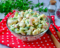 Салат с креветками, варёными яйцами, зеленью и свежими огурцами готовится достаточно просто и быстро. ... Для приготовления салата из креветок с огурцами и яйцами вам потребуется: креветки - 150 г; огурец свежий - 1 шт.; яйца - 3 шт.; укроп - пучок; соль - по вкусу; майонез - по вкусу.