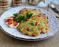 Сюда же выложить колбасу, нарезанную небольшими кубиками, и сырое яйцо. Сюда же выложить колбасу, нарезанную небольшими кубиками, и сырое яйцо. ... Жарить оладушки на среднем огне до румяности с двух сторон (приблизительно, по 2 минуты с каждой стороны).