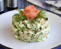 Для приготовления салата из слабосолёной сёмги с яйцом и огурцом потребуется: 80 г филе слабосолёной сёмги; 1 свежий (небольшой) огурец; 1 варёное яйцо; несколько веточек зелени укропа; 2 ст. л. майонеза; соль, перец чёрный молотый - по вкусу. ... Салат из слабосолёной сёмги с огурцом, зеленью и яйцом поперчить и, если понадобится, посолить. Салат из слабосолёной сёмги с огурцом, зеленью и яйцом поперчить и, если понадобится, посолить.
