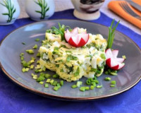Затем яйца порубить ножом (или нарезать небольшими кубиками). Яйца предварительно отварить в течение минут 8-10 с момента закипания воды, остудить и очистить. Затем яйца порубить ножом (или нарезать небольшими кубиками). Добавить к яйцам измельчённые зелёный лук и укроп.