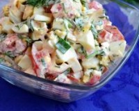Свежие помидоры для этого салата нужно нарезать на небольшие кубики. Вареные яйца очистить от скорлупы и порубить ножом. Вареные яйца очистить от скорлупы и порубить ножом. ... Сложить крабовые палочки, зелень, яйца и помидоры в миску, добавить соль, майонез и свежемолотый черный перец.