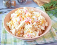 Этот вариант крабового салата с кукурузой, рисом и яйцами мы очень любим и готовим его достаточно часто. В нём все ингредиенты отлично сочетаются и приятно дополняют вкусы друг друга. ... Для приготовления крабового салата с кукурузой, рисом и яйцами потребуется: рис варёный (я использовала длиннозёрный рис) - 150 г; кукуруза консервированная - 150 г (1/2 банки объёмом 340 г); яйца - 4 шт.; крабовые палочки - 200 г; соль - по вкусу; майонез - по вкусу.