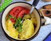 Чашку (или пиалу) ёмкостью не менее 250-300 мл, предназначенную для готовки в СВЧ, смазать сливочным маслом. В миску разбить яйца, добавить молоко и соль. В миску разбить яйца, добавить молоко и соль. Тщательно взбить молоко с яйцами вилкой (или венчиком), добавить чёрный молотый перец, натёртый на крупной тёрке сыр, перемешать.