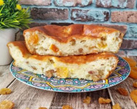 Для приготовления творожной запеканки с тыквой и изюмом потребуется: яйца - 2 шт.; сахар - 3 ст. л.; творог любой жирности - 360 г; изюм - 70 г; сода - 1/3 ч. л.; мука - 50 г; тыква, очищенная от кожуры и семечек, - 250 г. ... Для этого в глубокой миске нужно соединить сахар, яйца и творог. Перемешать творожно-яичную массу до однородности. Всыпать 1/3 чайной ложки соды (или 1 чайную ложку разрыхлителя) и ещё раз перемешать творожно-яичную массу.
