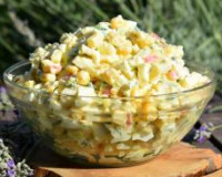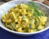 Для начала нужно отварить картофель в мундире. Яйца сварить вкрутую. Вареный картофель очистить и нарезать небольшими кубиками. Очищенные яйца тоже нарезать кубиками. Очищенные яйца тоже нарезать кубиками. Если крабовые палочки замороженные, разморозить и нарезать кубиками.