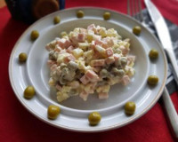 Зелёный лук вымыть, обсушить. Сварить вкрутую яйца (в течение 10 минут после закипания воды). Остудить варёные овощи и яйца. ... Яйца почистить и тоже нарезать на небольшие кубики. Соединить в салатнике нарезанные картошку, морковку и яйца.