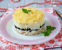 Затем отварное мясо извлеките из бульона и остудите. Яйца также заранее отварите в течение 8-9 минут в кипящей воде. Затем горячую воду слейте, а сами яйца остудите в холодной воде. ... Немного прижмите, чтобы слой стал более плотным. Смажьте яйца небольшим слоем майонеза. Отварные яйца очистите от скорлупы и натрите на крупной тёрке.