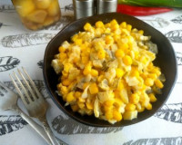 Добавить лук к яйцам. Вареные яйца очистить и нарезать кубиками. Вторую часть луковицы нарезать тонкими небольшими кусочками. Добавить лук к яйцам. Зерна кукурузы (если кукуруза свежесваренная - срезать зёрна с кочана) добавить к нарезанным яйцам и луку.