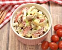 Куриные яйца отвариваем в течение 10 минут после закипания, затем остужаем в ледяной воде и очищаем. ... Твёрдый сыр нарезаем на небольшие кубики и выкладываем в миску со свининой и яйцами. Твёрдый сыр нарезаем на небольшие кубики и выкладываем в миску со свининой и яйцами.